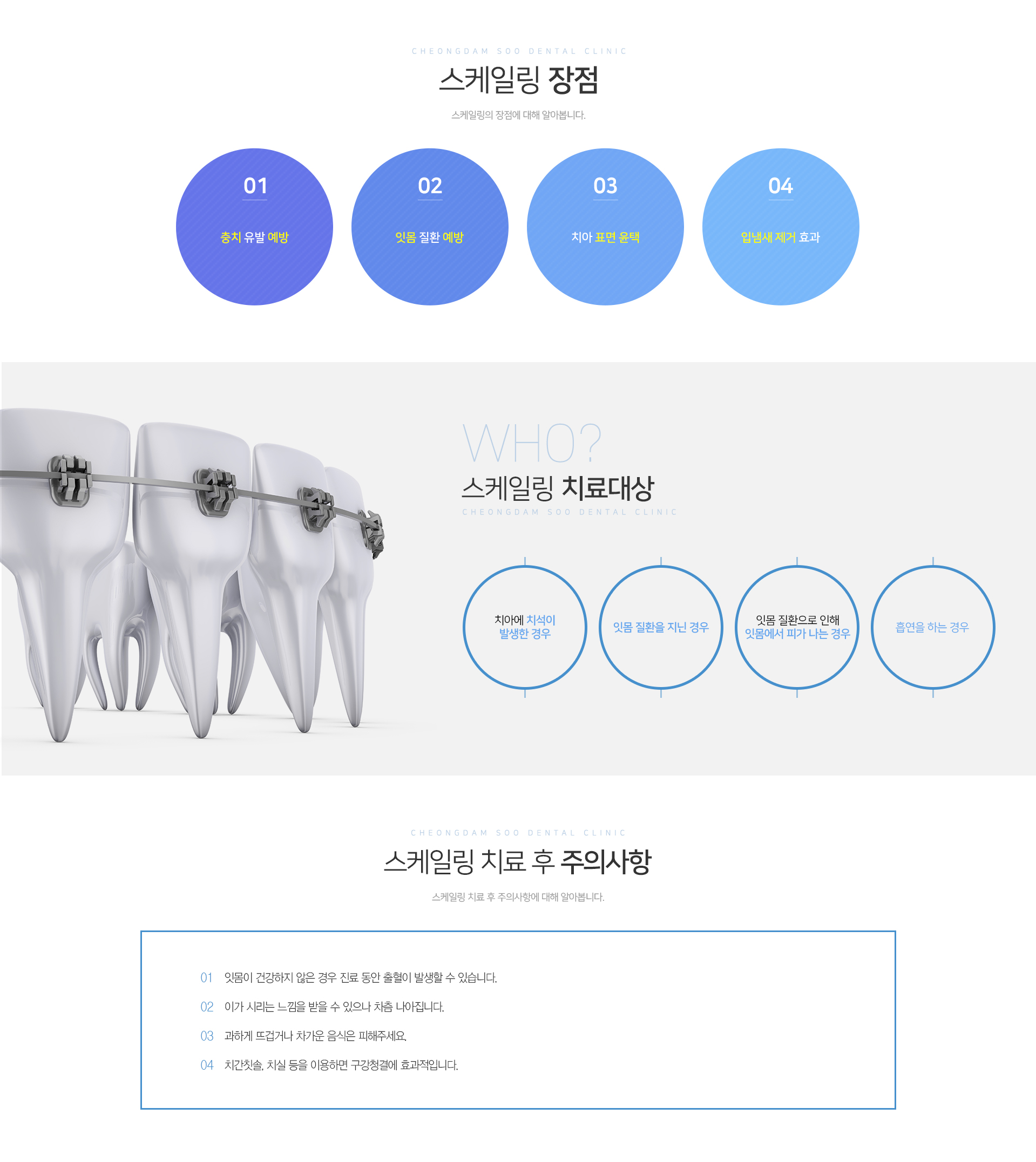 스케일링은 치아표면, 잇몸 안에 붙어 잇는 치석, 치태, 색소를 제거하는 구강 관리의 기본이 되는 구강치료로 치주 질환의 주된 원인을 제거할 수 있습니다.