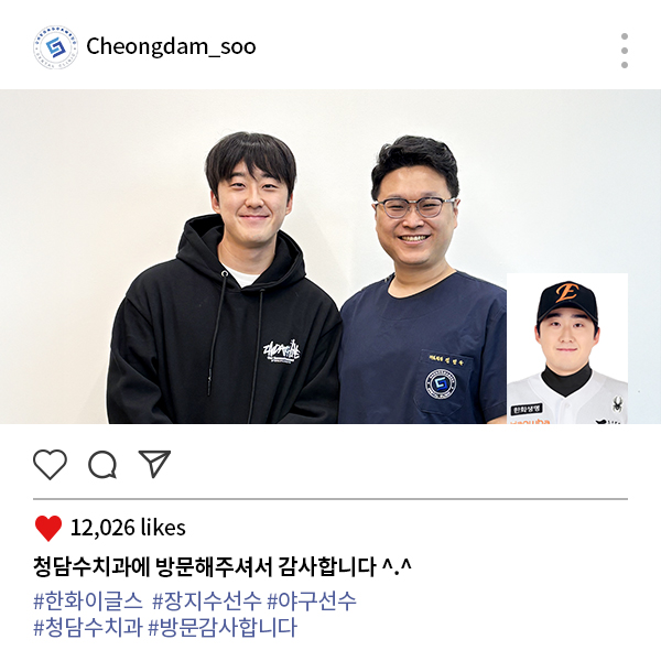 한화이글스 장지수 선수 방문 감사합니다. 페이지 정보 작성자 청담수치과 작성일 25-11-21 16:25 본문 오늘은 한화이글스의장지수 선수님께서소중한 시간을 내어저희 청담수치과를 방문해 주셨습니다.선수님께서 경기 중에도건강한 치아 상태를 유지하실 수 있도록!앞으로도 최선을 다해관리 도와드리겠습니다.항상 멋진 활약 응원합니다! 화이팅! :D❤️문의전화 ☎ 042-365-2879 카카오상담 (클릭)네이버예약 (클릭)청담수의 특별한 혜택보기 (클릭) 목록 답변 이전글한화이글스 엄상백 선수 방문 감사합니다. 25.11.21 다음글한화이글스 문동주 선수 방문 감사합니다. 23.12.14 댓글목록 댓글목록 등록된 댓글이 없습니다.