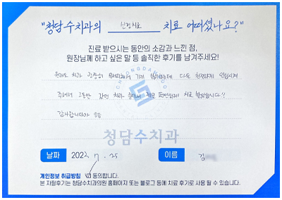 [신경치료] 김OO님 자필후기 페이지 정보 작성자 청담수치과 작성일 22-10-26 17:57 본문 [신경치료] 김OO님 자필후기 목록 답변 이전글[임플란트] 김OO님 자필후기 22.10.26 다음글[레진치료] 한OO님 자필후기 22.10.26 댓글목록 댓글목록 등록된 댓글이 없습니다.