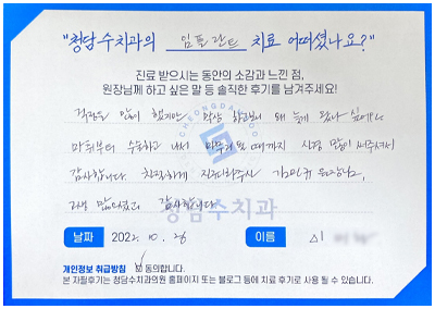 [임플란트] 이OO님 자필후기 페이지 정보 작성자 청담수치과 작성일 22-10-26 17:58 본문 [임플란트] 이OO님 자필후기 목록 답변 이전글[임플란트] 한OO님 자필후기 22.10.27 다음글[임플란트] 김OO님 자필후기 22.10.26 댓글목록 댓글목록 등록된 댓글이 없습니다.