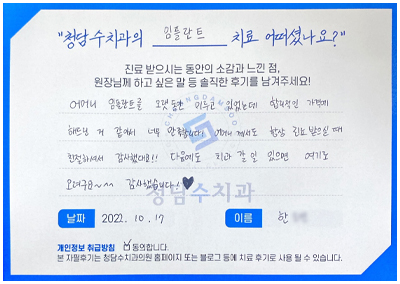 [임플란트] 한OO님 자필후기 페이지 정보 작성자 청담수치과 작성일 22-10-27 13:24 본문 [임플란트] 한OO님 자필후기 목록 답변 이전글[충치치료] 김OO님 자필후기 22.10.27 다음글[임플란트] 이OO님 자필후기 22.10.26 댓글목록 댓글목록 등록된 댓글이 없습니다.
