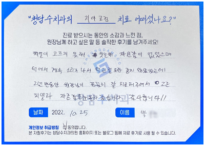 [치아교정] 박OO님 자필후기 페이지 정보 작성자 청담수치과 작성일 22-10-27 13:27 본문 [치아교정] 박OO님 자필후기 목록 답변 이전글[치아교정] 이OO님 자필후기 22.10.27 다음글[치아교정] 박OO님 자필후기 22.10.27 댓글목록 댓글목록 등록된 댓글이 없습니다.